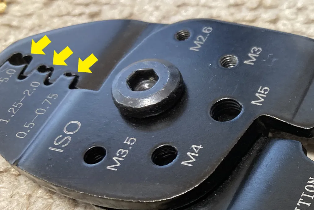 で、銅線部分とギボシをサイズの合った以下のカシメ型にセットしてグッと持ち手を握ることで圧着されるという寸法ですが、