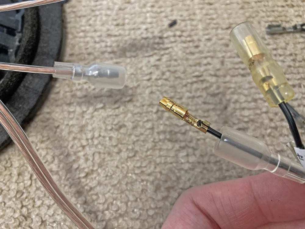 ・車体側のコネクタに接続するコネクタ、ウーファー部ウラに接続する平型、二股で分岐しているのがツイーター部に接続するギボシ型。